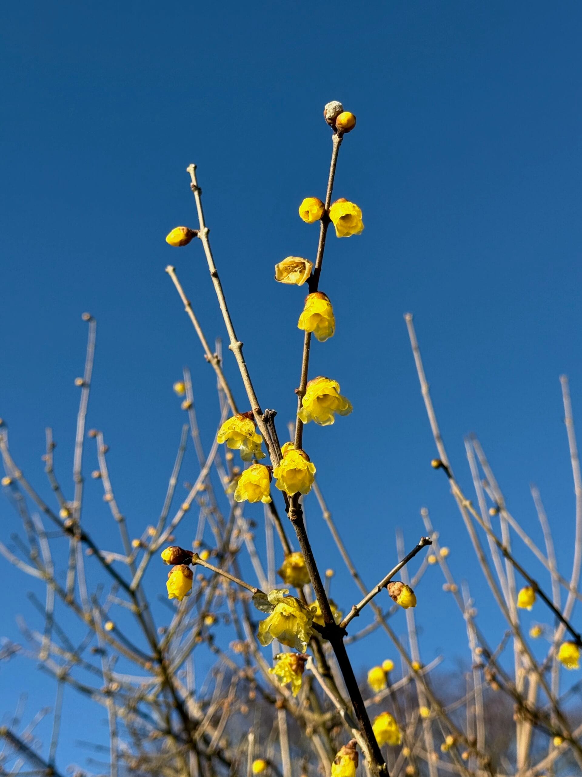 A native to mountainous regions in China, it is hardy to -15 °C (5°F), wintersweet does well in sheltered positions in combination with other plants that have attractive features at other times of year when it is not very interesting. I find that proximate shrubs with evergreen foliage especially enhance its delicate flowers.